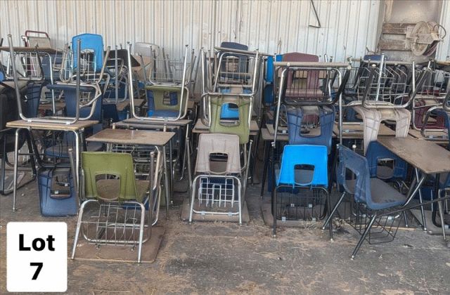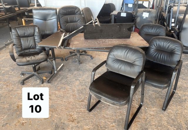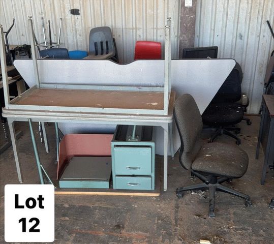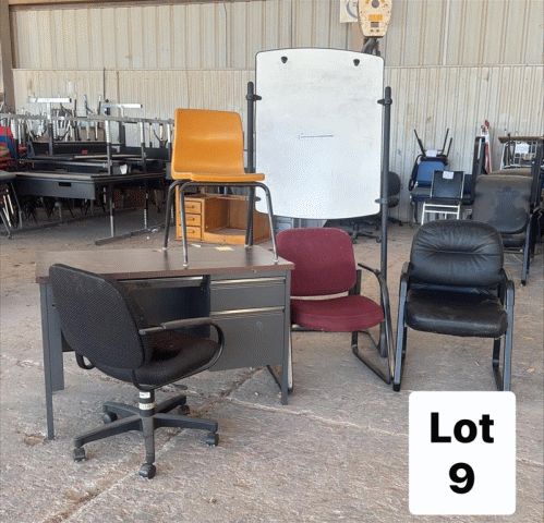 Qty 1 Metal Desk, 2 Rectangular Tables, 1 Trapezoid Table, Approximately 15 Chairs; Location 1