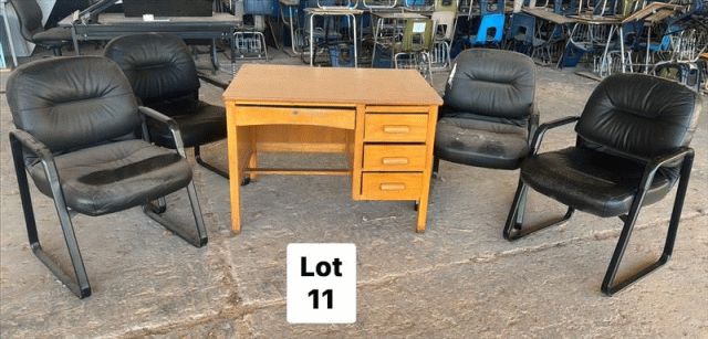 Qty 1 Wood Desk, 4 Black Chairs; Location 1