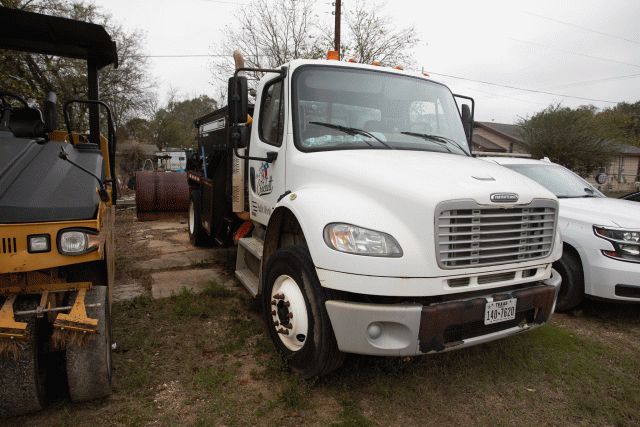2010 Freightliner M2 F-21 Patch Truck; VIN 1FVACYBS5ADAU0407; 82,864 Miles showing; Cummins 8.3L Diesel; Auto; Bucket seat; A/C; PS; Air brakes; Radio; Has key; STILL IN USE - MILEAGE MAY INCREASE; Bed hydraulics & street patching agitator/equipment is non-functional