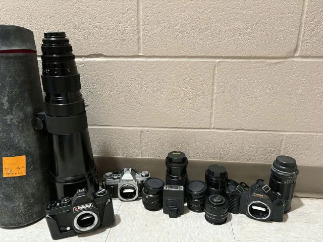 3 vintage cameras: a Canon T50, Canon AE-1 and a Gaf L-17. 6 different kinds of lenses that go with the cameras, all in a bag with lens cleaner and two 100 ft measuring tapes; SN 112430, 1934265, 3011139; Location 1