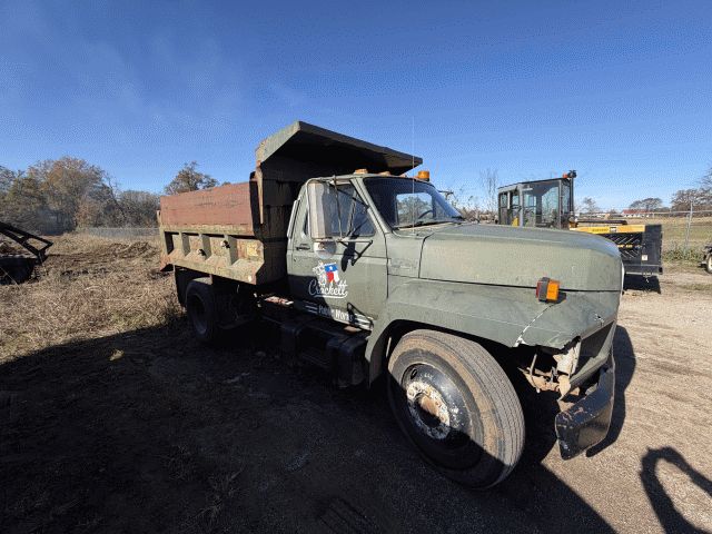 1993 Ford F700 6 Yard Dump Truck; VIN 1FDWK74C4PVA17846; 79,558 Miles showing; Cummins 5.9L Diesel; Auto; Bench seat; Rubber mats; PS; Air brakes; Radio; Has key; Last utilized 2025; Bed hydraulics inoperable; Running when removed from service