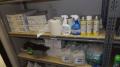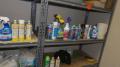 Assortment of chemicals, 2 shelf units, 4 buckets and 9 dustpans; Location 22