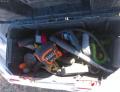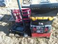 LADDER; MVP SUPERLIST JACK; RED JACK STAND; RED METAL TOOLBOX W/HAND TOOLS; BLACK AND YELLOW TOOLBOX W/HAND TOOLS; BLACK AND YELLOW BOX W/ HAND TOOLS; RED HYPER TOUGH TOOLBOX; SCHUMACHER BATTERY CHARGER; BLACK HARNESS; (2) PROPANE TANKS; Location 2