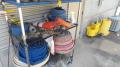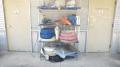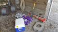 2 Patio fire accessories, 5 propane bottles, 1 cooler, 2 roles of cable, 5 air bottles, 7 nature trail signs, assorted PVC, 1 shelving rack, 1 wheeled cart; Location 24