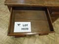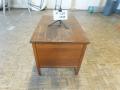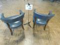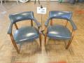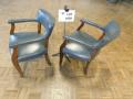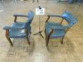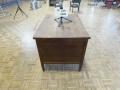 Lot of 1 wooden desk and 2 wood frame chairs, Units have wear and tear, wood and vinyl damage. Wood joints are loose and separating.