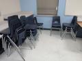 Used approximately (15) student chairs, (5) various size tables, teacher desk, bookshelf, kidney table