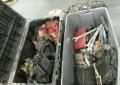 (4) LL300N SYSTEM CASE ONLY; BLACK HUSKY TOTE W/MISC TOOLS & ITEMS; GREEN SPOOL OF WIRE; SMALL RED AIR COMPRESSOR; GRAY CUSHION CHAIR ON WHEELS; BROWN EXECUTIVE CHAIR; BLACK FABRIC SWIVEL CHAIR ON WHEELS; BLACK DESK CHAIR; GRAY FABRIC ROLLING CHAIR; Location 1